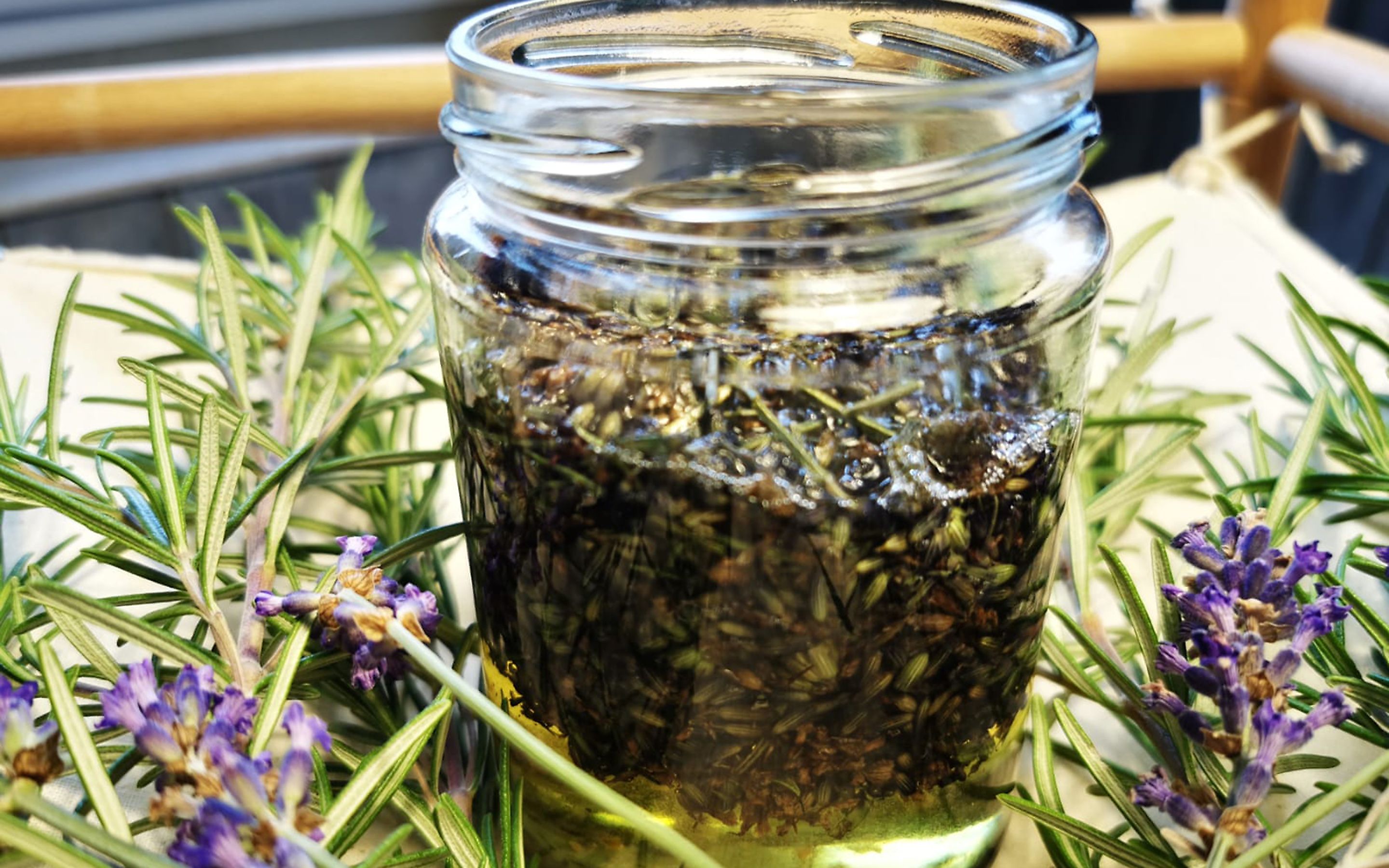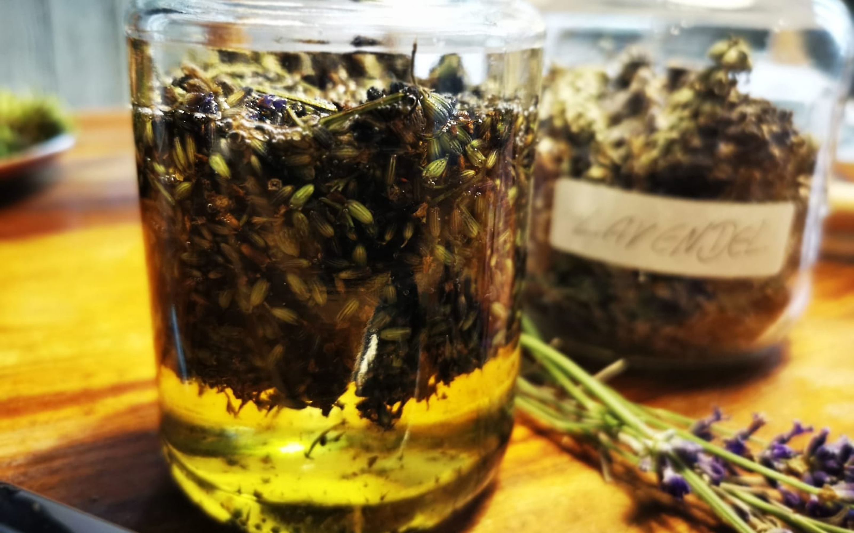 1. Nach der gründlichen Reinigung von Glas, Deckel und Löffel wird das Gefäß zur Hälfte mit den getrockneten Lavendelblüten befüllt, mit einem Löffel angedrückt und im Anschluss mit dem hochwertigen Mandelöl aufgegossen. Damit das Öl nicht verdirbt, müssen alle Planzenteile mit Öl bedeckt sein.