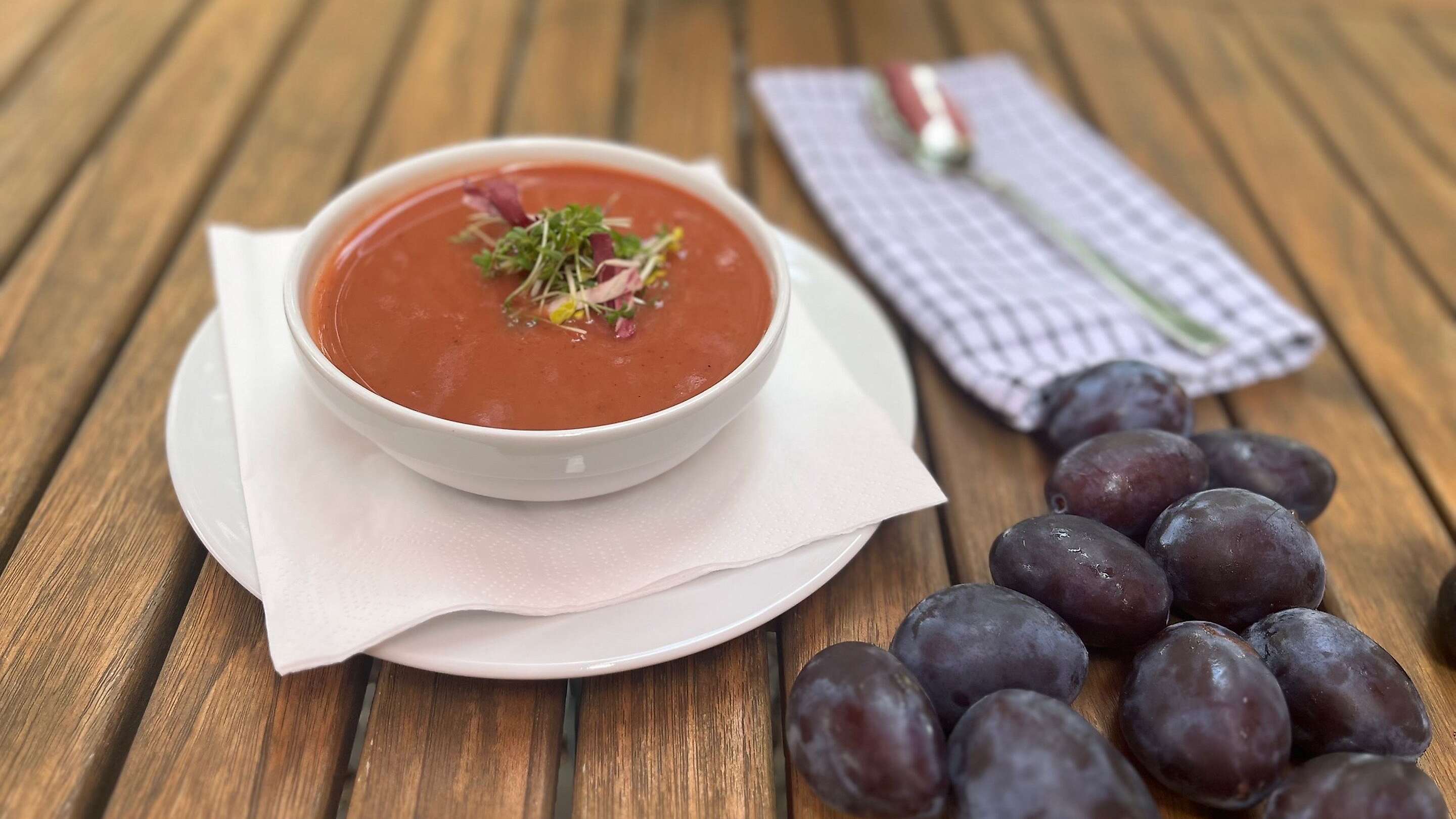 Im Herbst ist der Tisch reich gedeckt mit rotbäckigen Äpfeln, orange leuchtenden Kürbissen, lila Pflaumen und vielen anderen regionalen Köstlichkeiten. Es ist die Zeit der Ernte, des Einkochens und Einlagerns für die Wintermonate. Aber einiges will auch sofort verarbeitet werden und da sind neue Rezeptideen sind gefragt, die den Klassikern der Herbstküche neuen Schwung geben. Hier gibt es mal ein Pflaumenrezept der ganz anderen Art – eine würzige Pflaumensuppe nach Landhaus-Art.