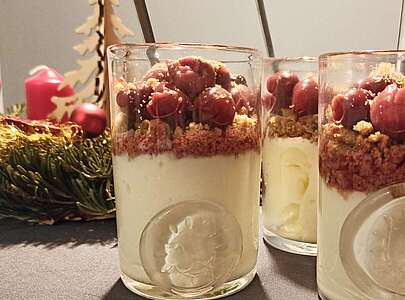 Tipp: Die Creme hält sich im Kühlschrank sehr gut. Spekulatiusbrösel, Kirschen und Topping erst kurz vor dem Servieren hinzufügen, damit alles schön crunchy bleibt.