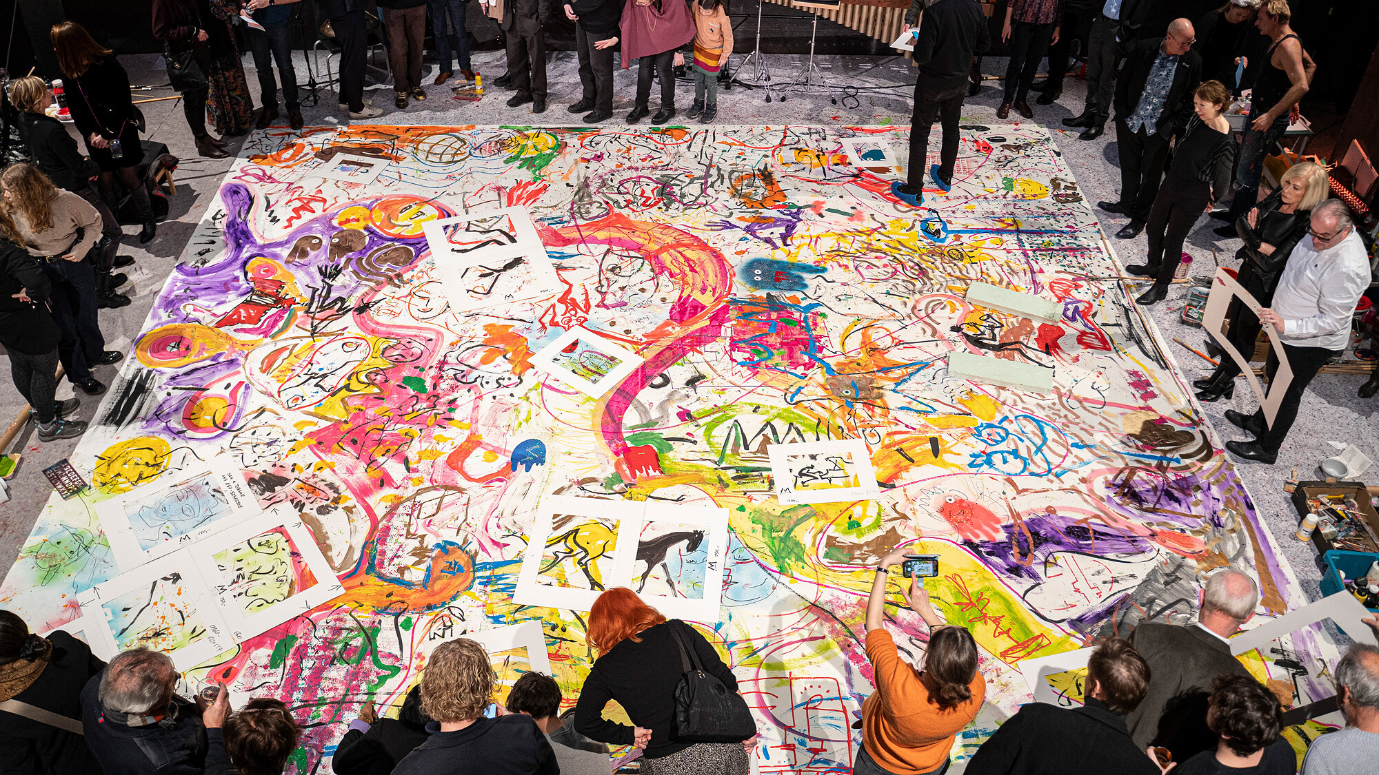 Was sich sonst hinter geschlossenen Ateliertüren vollzieht, wird an diesem Abend zum öffentlichen Happening mit Livemusik. Die Spielfläche: ein Papierquadrat von 8 mal 8 Metern auf dem Fußboden des Nikolaisaal-Foyers. Mit den ersten »Planeten«-Klängen des Max Doehlemann Quintetts beginnt ein faszinierendes Spektakel, bei dem sich fünf Künstlerinnen unmittelbar von der Musik inspirieren lassen und vor aller Augen ein »kosmisches« Gemeinschaftswerk erschaffen. Ein lustvoll beflügelndes Match nicht nur zwischen Musik und Bildender Kunst, sondern auch zwischen den Akteurinnen und ihrem Publikum!